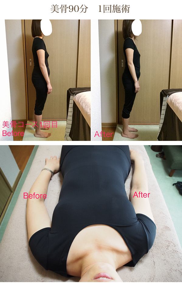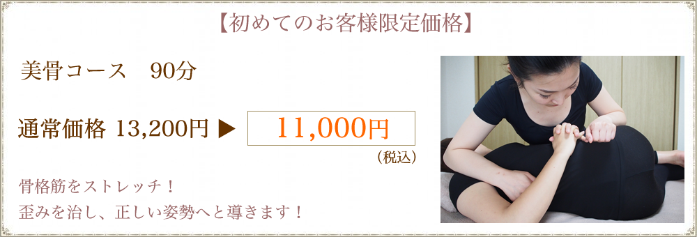 美骨コース 90分/13,200円(初回11,000円) 自分でも知らない歪みを知り、自分では動かせない硬い筋肉をゆるませます。 腰・肩・首のコリ改善には一番おすすめのコースです。 オイルマッサージではなく、ストレッチをメインとしたコースです。 セルライトを揉む訳ではありませんが、骨格が整うことで見た目が細くなります。 また、血行が良くなり代謝が上がることでより痩せやすい体を作ります。 痩身コースとの相性抜群!