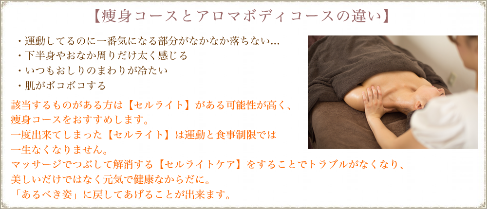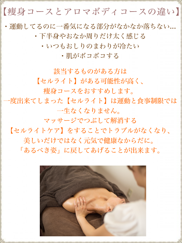 プルクラでは、痩身コース、アロマボディコースに分けて施術をご案内させて頂いております。